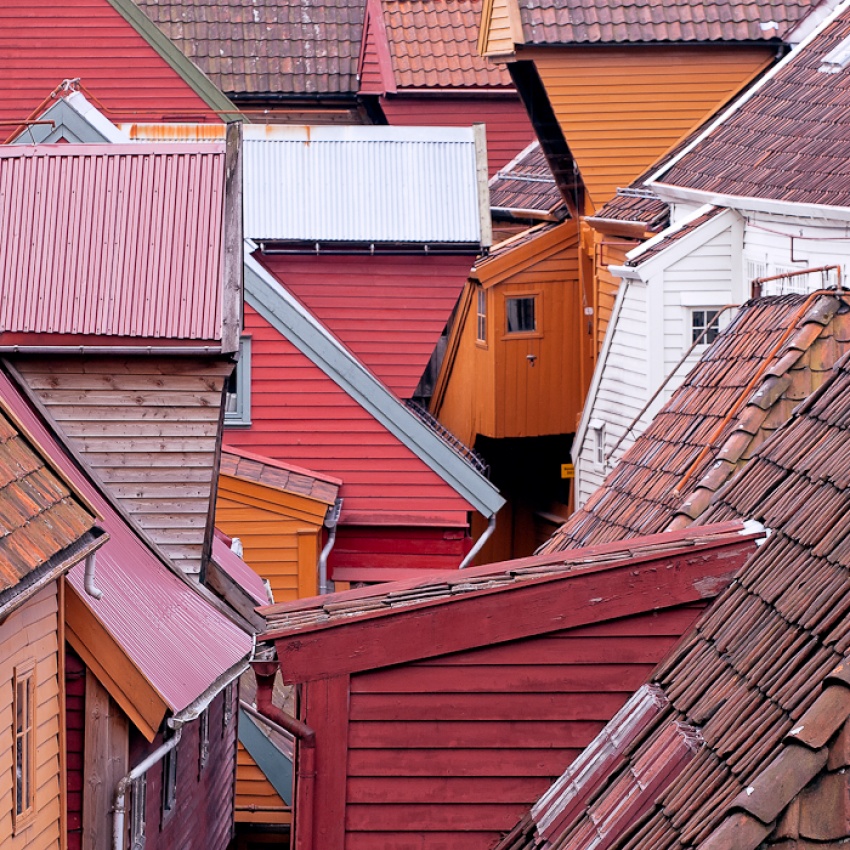This image shows the labyrinth of roof tops at Bryggen, the hanseatic settlement in Bergen, Norway. This site features on the UNESCO world heritage listing and is best known from the row of facades along the waterfront. These roofs are taken at the back of the site.