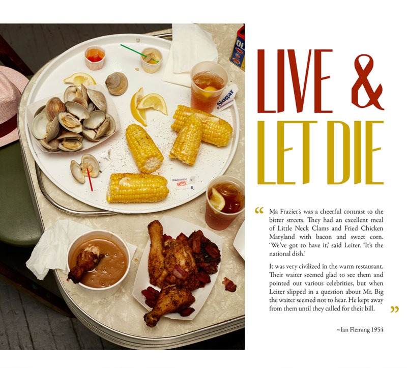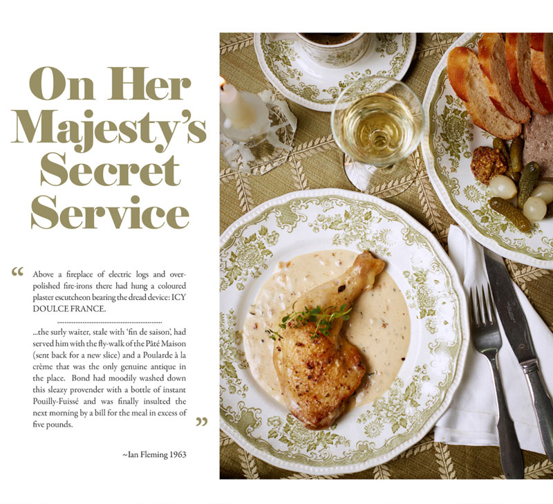 English photographer Henry Hargreaves had the inspiring idea to recreate Bond's meals in photos. He contacted food stylist Charloyye Omnés and together they meticulously brought these gourmet dinners from the page to real life. Since the books of James Bond mainly takes place during the 1950's, they had to go great lengths to find the proper attributes, such as salt strainers, glasses and cutlery.