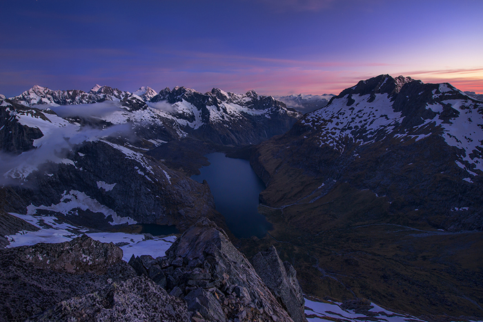 The Darran Mountains are located in the Fiordland National Park, a remote southeast corner in the South Island of New Zealand. It is an area where snow-capped mountains, rivers of ice, deep lakes, unbroken forest and tussock grasslands form a landscape of exceptional beauty, including the well-known Milford Sound.