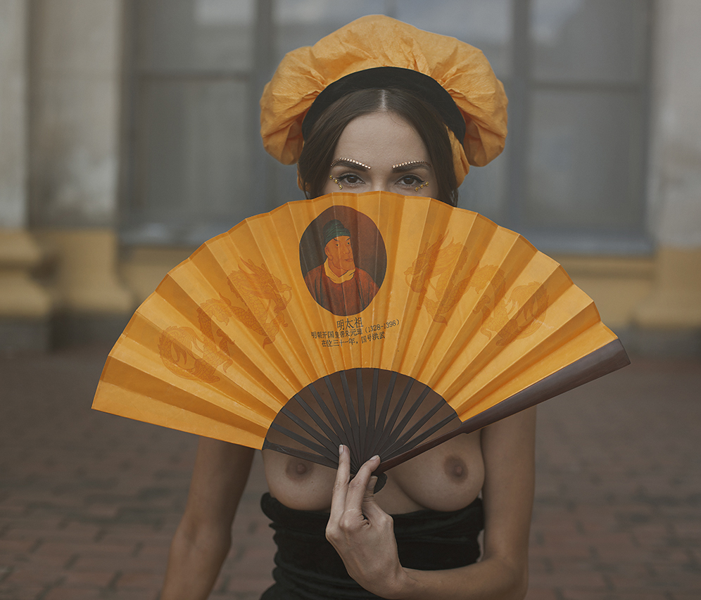 Another work among our favorites is a lady in a fountain with a teapot in her hands – ‘Secret Garden’. Sensual bodylines of a woman in a contrast morning light, also a black and white image. It was late March and the snow was still around. Cold air and dazzling light. As we used to work on open-air locations most of the time, there are always some passers-by or just curious people. Despite all these, the model conveyed necessary expression and emotion under our direction of the scene.