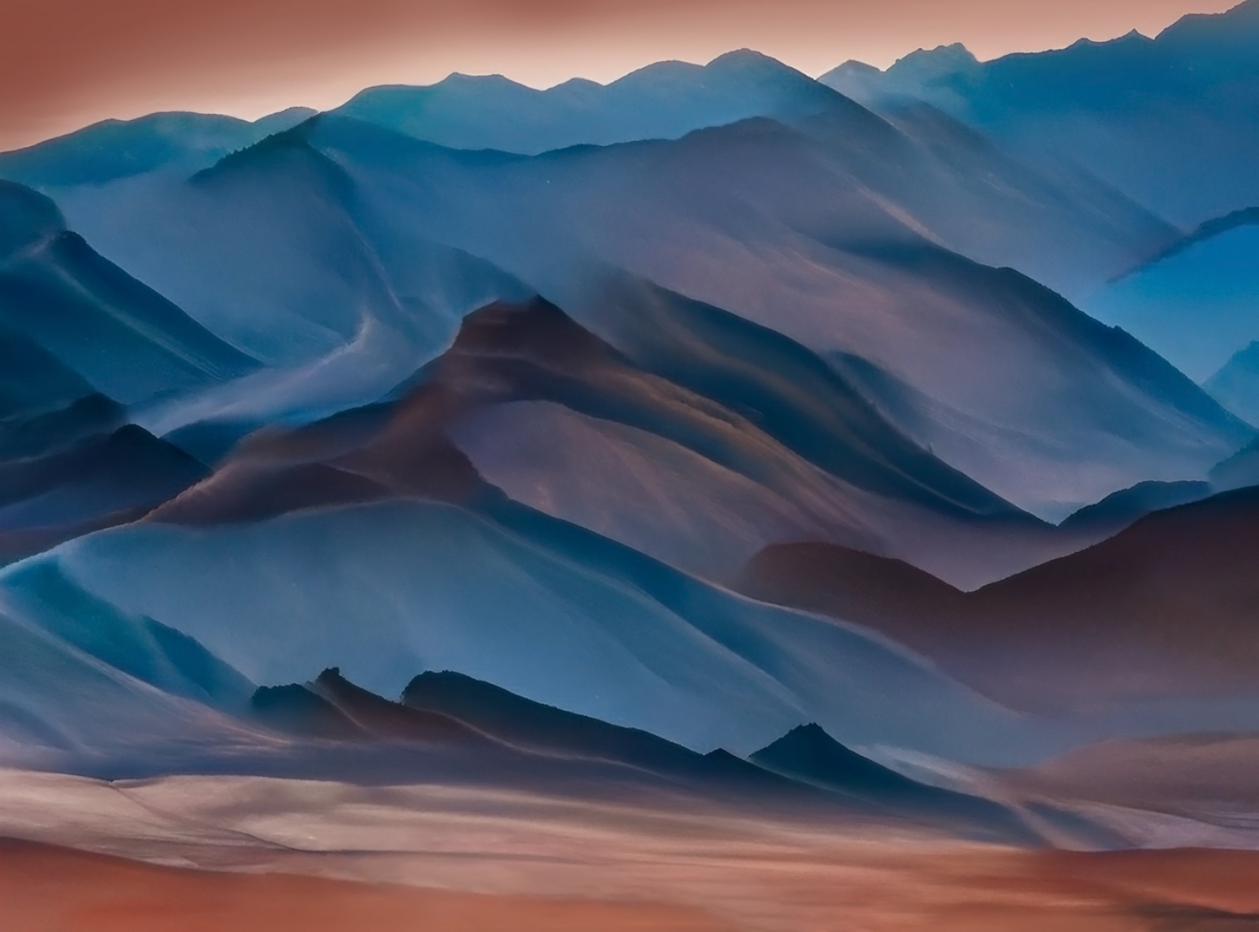 A foggy mountain dreamscape began life as a section of Eucalyptus tree bark. The “skin” of this tree is a spectacular visual crayon box of colours when it rains. On a day that it was pouring, I shot hundreds of bark sections, selected the captures I believed had potential to convert into landscapes, and picked one image that most resembled my California Coast “home” colours with fog resting on the land.