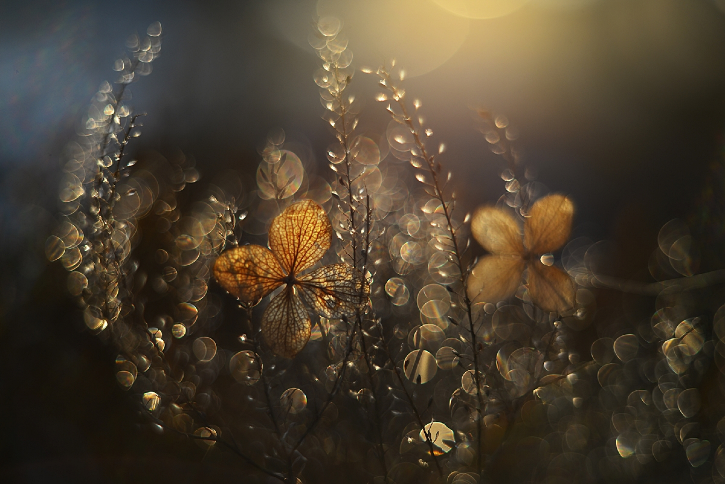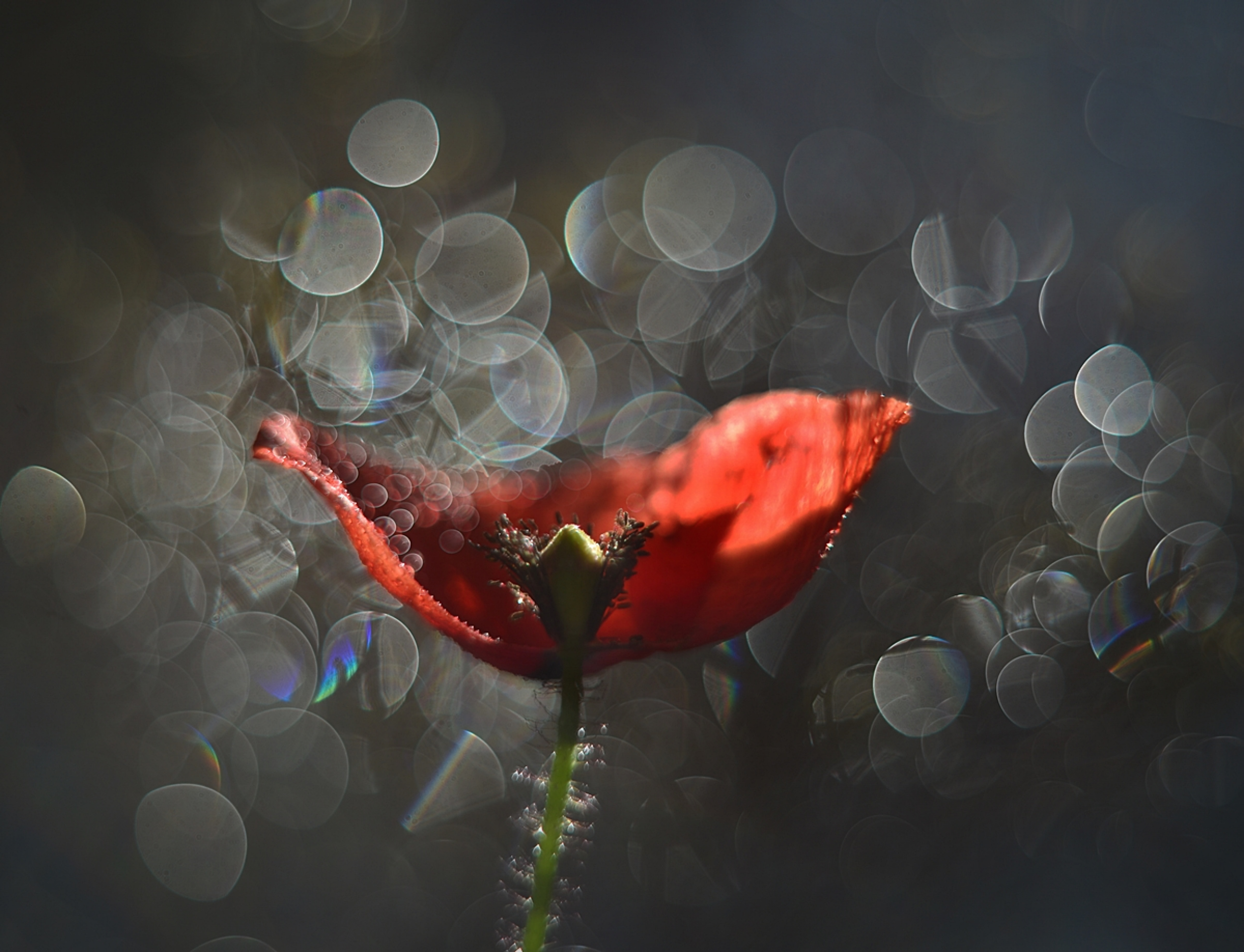On the poppy flower, rays of sunlight are falling on it but in the upper part, the sun was low behind the poppy.  I placed a glass sprinkled with water. This gave me a decorative background in circles. For this picture, I used a double exposure: the first shot of the flower, and the second from the background with a dewy glass. I set the exposure time to 1/1600s and the aperture to f1.8.
