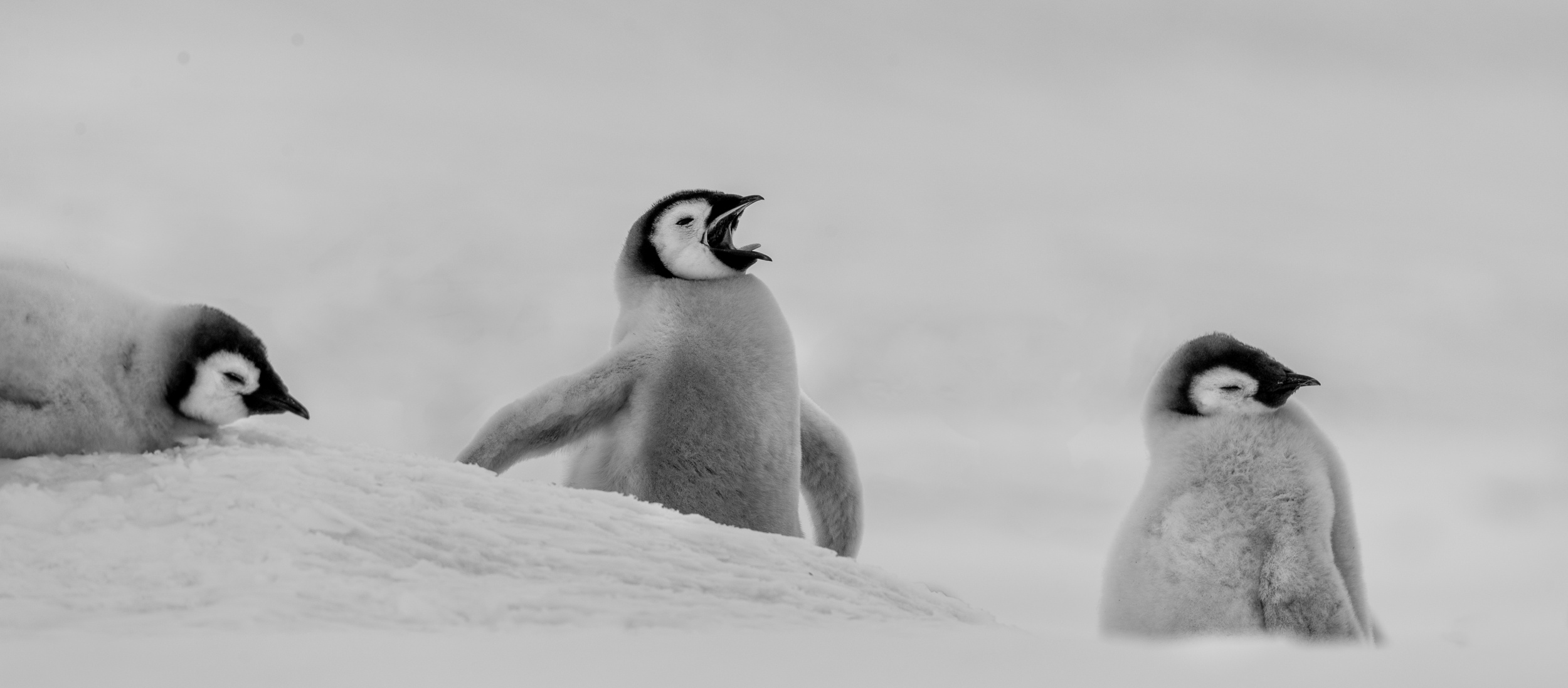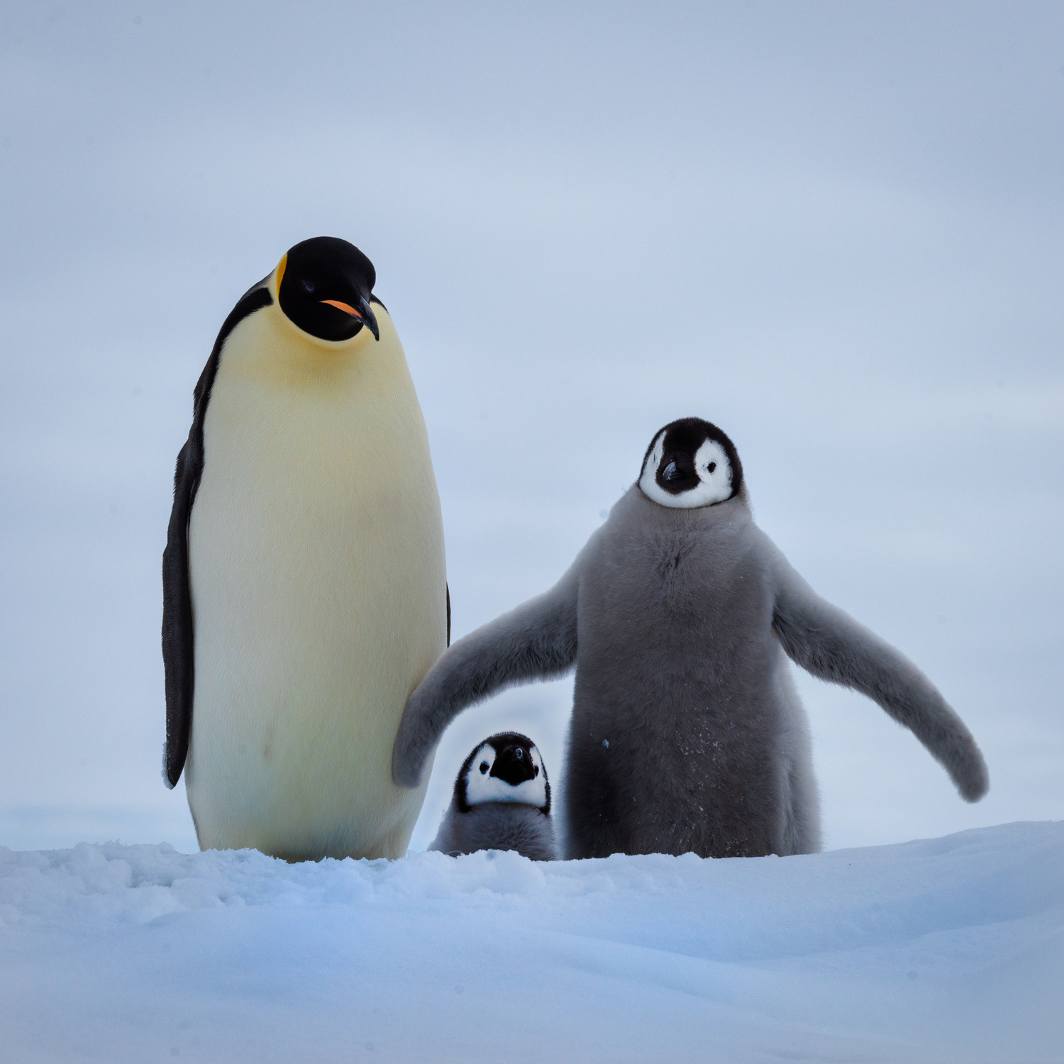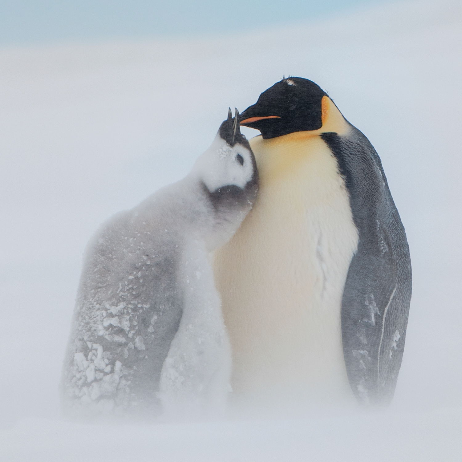 Snow Hill Island is home to up to 10,000 Emperor Penguins, making it the northernmost location on the continent where these penguins can be found. Wild Emperor penguins are only found in Antarctica. They breed and raise their young mostly on ‘fast ice’, a floating platform of frozen ocean which is connected to the land or to ice shelves. From birth, they spend their entire lives in and around the Antarctic ice, although very rarely vagrants have turned up off the coast of New Zealand. Emperors are the biggest of the 18 species of penguin found today, and one of the largest of all birds. They are approximately 120cm tall (about the height of a six year old child) and weigh in at around 40 kg, though their weight does fluctuate dramatically throughout the year. Emperors are the least common Antarctic penguin, with global population estimates of 265,500–278,500 breeding pairs. Emperor penguin colonies have been discovered and counted from space. For the last 15 years, British Antarctic Survey (BAS) scientists have been looking for new colonies by searching satellite imagery for their guano stains on the ice. There are now 66 known emperor penguin colonies around the coastline of Antarctica. Emperors incubate their eggs during the long dark southern winter months. Courtship displays are intricate but copulation is quick and the female lays a single egg in May or June. She then passes it over to her mate to incubate - and she’s off. She spends the next nine weeks at sea, feeding. The male carefully balances the egg on his feet for between 65 – 75 days to keep it warm in a specially adapted brood pouch, and off the snow surface, before it hatches. Emperors are uniquely adapted to survive these harsh conditions when temperatures can drop down to a bone chilling -50°C and with winds of up to 200km/hr. They have two layers of feathers, a good reserve of fat and proportionally smaller beaks and flippers than other penguins to prevent heat loss. Emperors also have feathers on their legs, so their ankles don’t get too chilly. Even their feet are adapted to the icy conditions, containing special fats that prevent them from freezing and strong claws for gripping the ice. But most remarkably, colonies of adults and chicks work together to huddle for warmth. 5,000 or more tightly packed adults and chicks shuffle around, so each takes a turn - but not too long - on the outside of the huddle where it’s cold. This is in complete contrast to their quarrelsome and territorial neighbours, the Adélie penguins. Their strong sense of community literally keeps them alive. Their impressive size and colour makes them extremely popular and a favourite subject for wildlife photography.